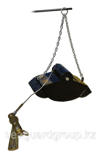 После ослабления цепей и троса крюк-сбрасыватель поворачивается под действием противовеса, освобождая скобу с цепями.